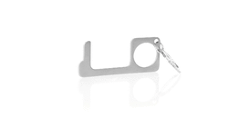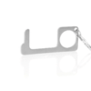 Llavero higiénico anti-contacto, fabricado en resistente acero inox. Especialmente diseñado para evitar tocar con las manos superficies de uso común (picaportes de puertas, interruptores, grifos de uso público, cajeros automáticos…). Con cómodo troquel para el dedo y presentado en bolsita individual. Recomendado para marcaje en láser.