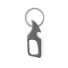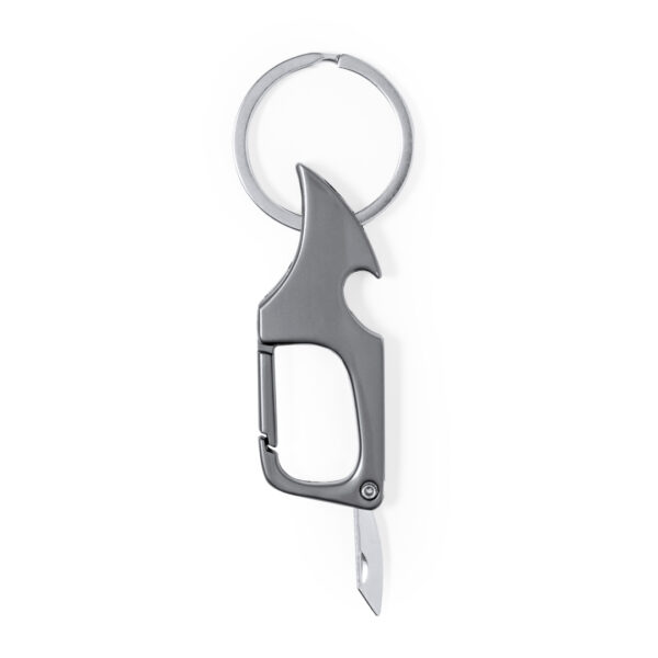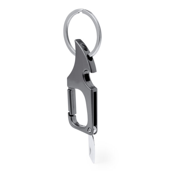 Práctico llavero abridor metálico. Con anilla para llavero y mosquetón para un rápido enganche. Con abrebotellas en uno de sus extremos, incorpora un pequeño cuchillo de acero inox en el extremo opuesto, ideal para abrir cartas, paquetes, etc. En elegante color negro metalizado y presentado en bolsa de papel reciclada.